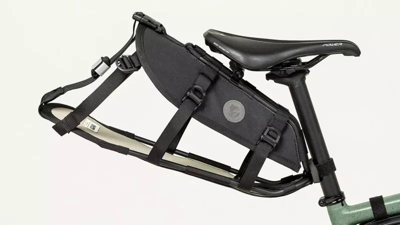 Flexible holder for bikepacking gear that attaches to saddle and seatpost for maximum stability. The construction has aluminum frames where the lower section can move freely to accommodate larger items. Two sets of compression straps will secure your drybag or tent, and attaching and detaching gear is easy thanks to the quick-release camlock buckles. Comes with an extra compression strap for larger loads and is perfect with the Specialized/Fjällräven Seatbag Drybags, 10 or 16 liters. Its compact size (45 x 11 x 20cm) makes it compatible with most frames and wheel clearances. Part of the Specialized/Fjällräven series for urban rides and bikepacking adventures.
